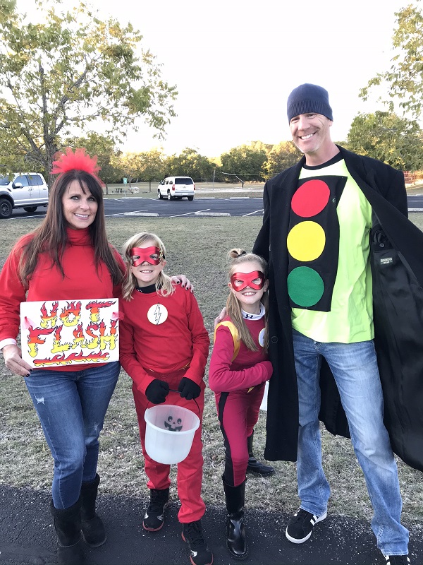 On Halloween night our neighbors all met down at the neighborhood park where we all hopped aboard a trailer for a hay ride. In true Anderson fashion we again came up with themed costumes for the special night... Jett & Delilah were The Flash & Jessie Quick (from one of their favorite shows), Rich was a flashing light, and I was a "hot flash", of course! We went trick or treating throughout the community and all of the kids got enough candy to open their own candy store! Such fun and what a wonderful place we live!! It's so neat when the last stop of the night was at the home of one of the kids very favorite teachers!